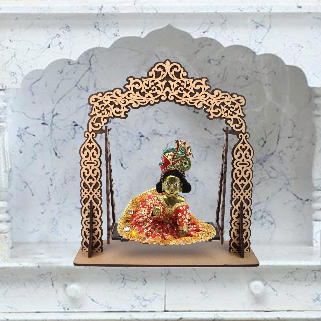 Imbue your sacred space with the serene charm of our Kanha Wooden Julo, masterfully crafted to enhance your spiritual rituals. This traditional swinging seat is designed for the idols, providing them a gentle sway that symbolizes the joy and playfulness of divinity.